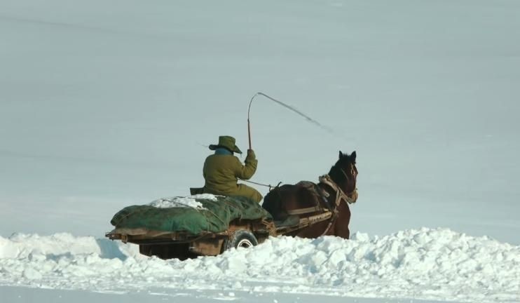 另一组画面中,江海洋驾着马车穿行于无垠雪野,哼着轻快小调赶往驻地。